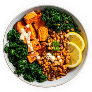 Lunch: Warm lentil veggie bowl with lentils, roasted sweet potatoes, kale, and lemon-tahini dressing