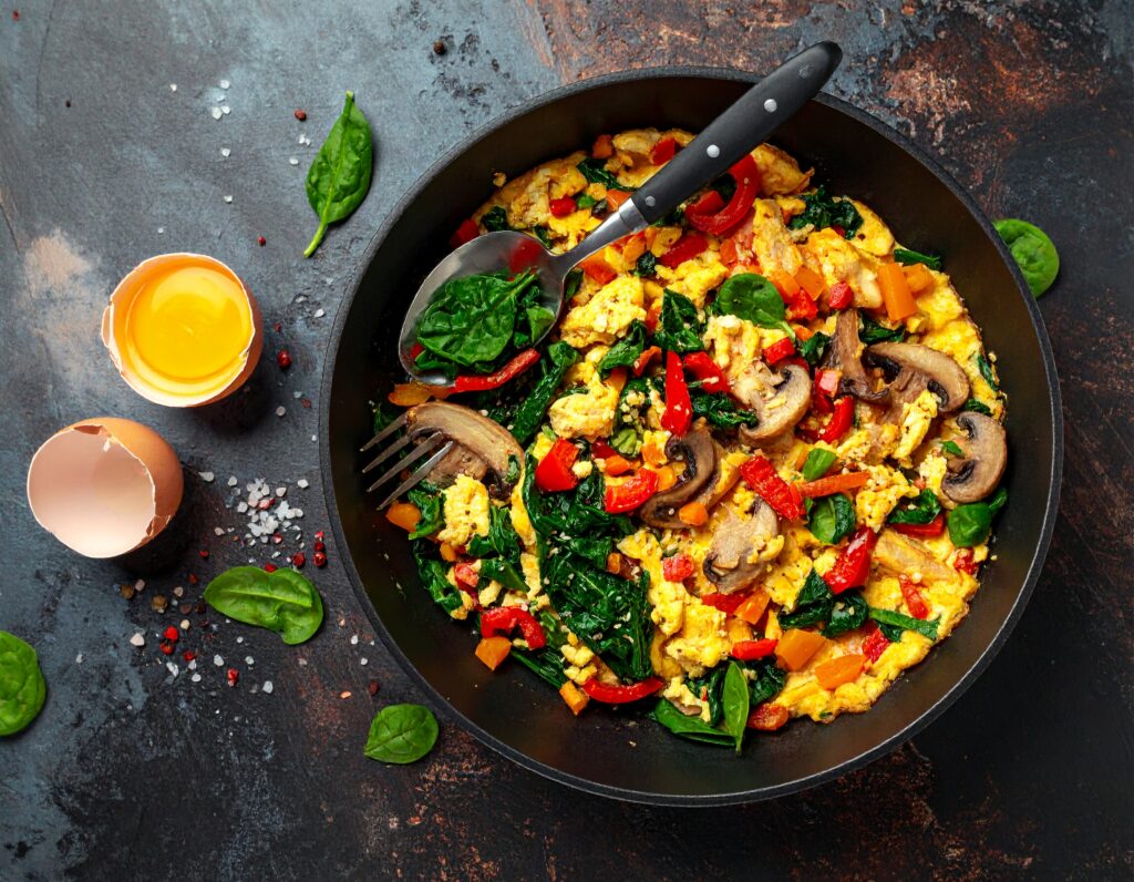 Breakfast: Veggie egg scramble with 2 eggs, spinach, mushrooms, diced onion, and avocado slices