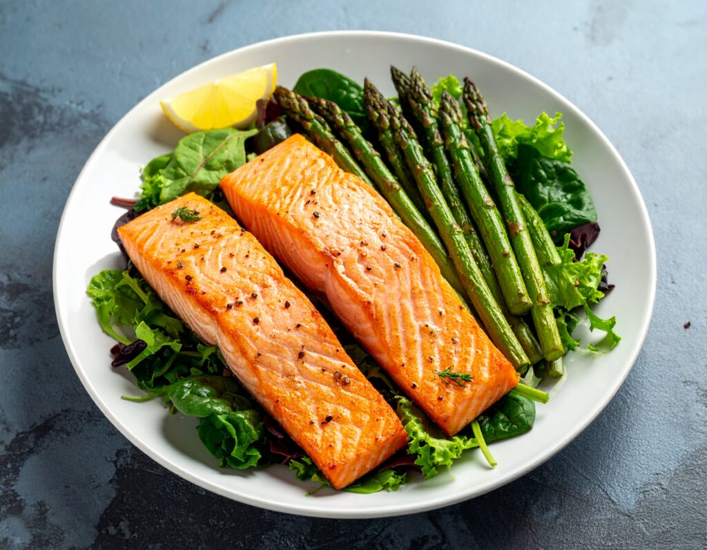 Dinner: Baked salmon with roasted asparagus and garlic sautéed spinach